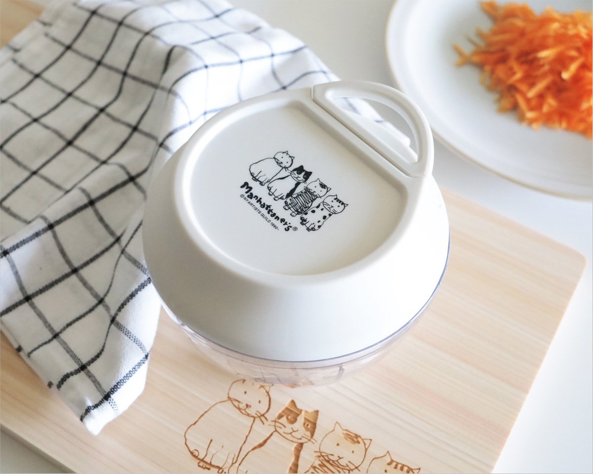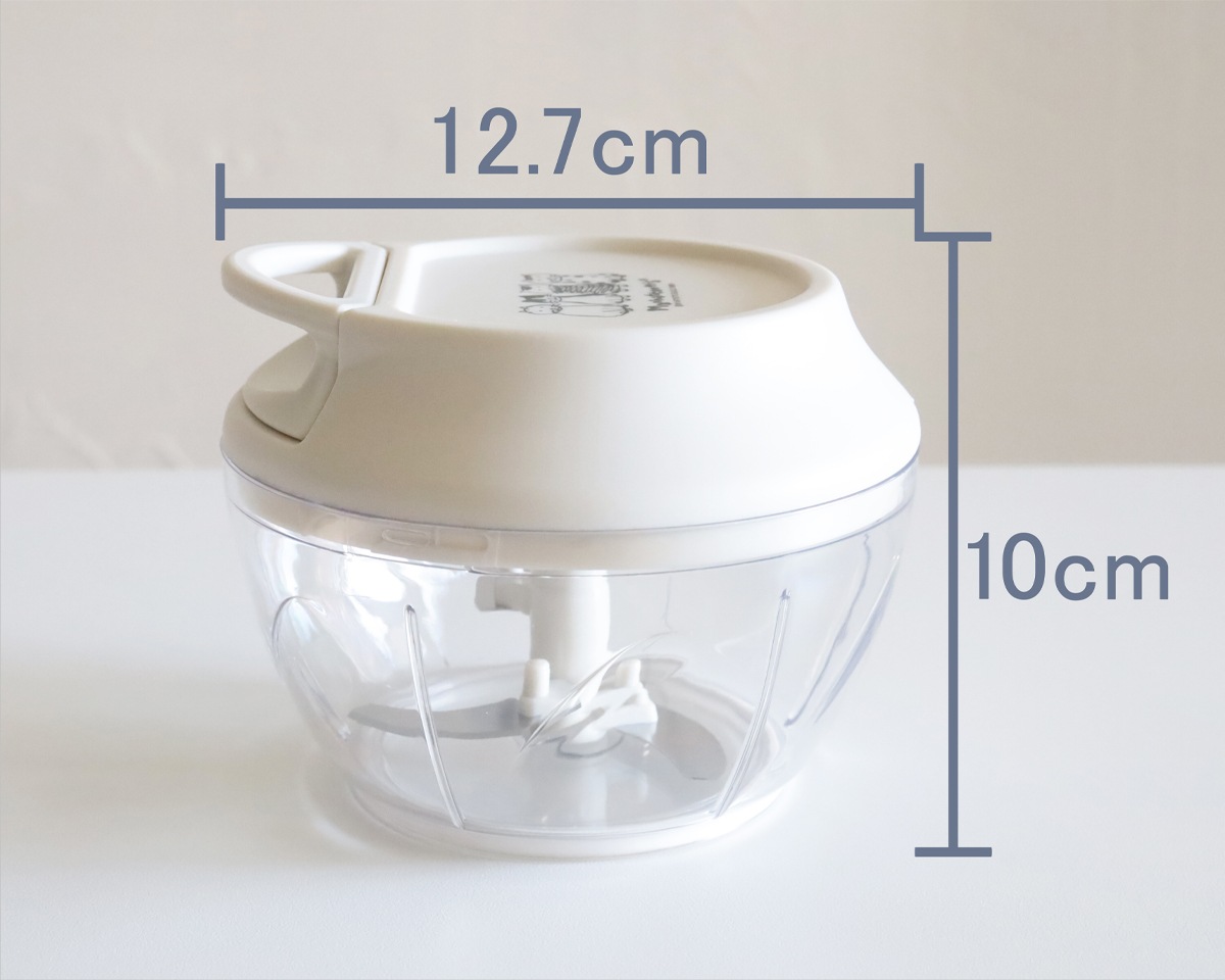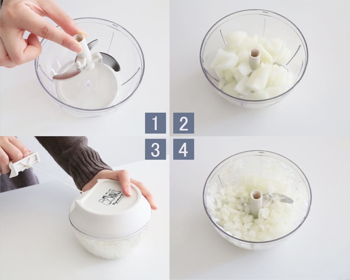 1.ボウルの突起部分に刃をセットする。 2.適当な大きさに切った食材を入れる。 3.蓋を閉め、時計回りに「カチッ」と音がするまで回す。 しっかりとセットされていることを確認したら、本体を押さえながらハンドルを引く。 4.蓋を開け、刃を取り出してから食材を取り出す。