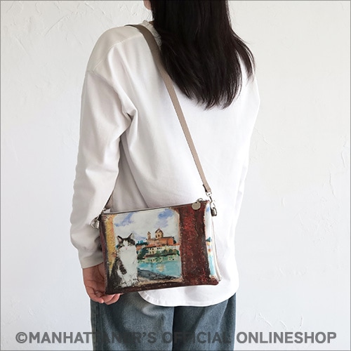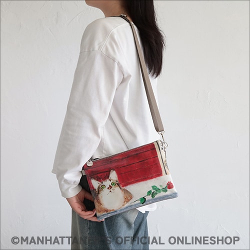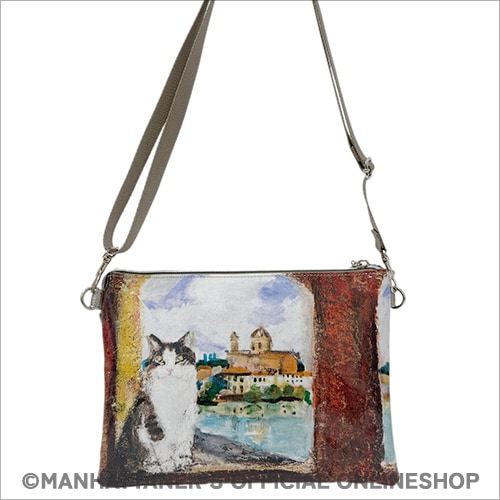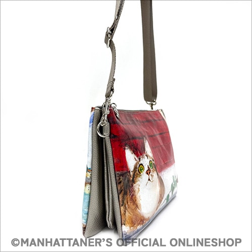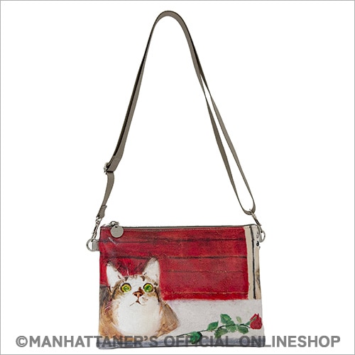 PVC素材は水濡れが気になりにくく、お手入れが簡単です。 プリントは前・背で異なる作品を使い、 どちらもメインになり楽しめるバッグシリーズです。 ![]() ![]() ![]() 正面 ![]() 背面 ![]() 側面 ショルダーストラップは取り外し可能 ![]() 見た目はコンパクトでも収納力は抜群! 真ん中にファスナー付き収納スペース ![]() 片側にカードポケットが10カ所 長財布も収納可能 商品素材: (本体)塩ビプリント生地 (付属)ポリウレタン 商品サイズ: 縦18cm×横26cm×マチ4cm 重さ:300g 中国製 ![]() "Michelangela once again at Plaza de Toros de Las Ventas" 「ミケランジェラ、ラス・ベンタス闘牛場にふたたび」 1996年から1997年にかけて描かれた「すっ飛びフェデリコ物語」というシリーズ作品があります。突然翼を得て飛べるようになったフェデリコがニューヨークに飽き足らず、イタリア、フランスやスペイン、さらにはアフリカや南米まで飛行訪問し、途中やはり翼猫のミケランジェラやマーベリック・クマと出会うという物語です。一緒に世界中を旅したフェデリコとミケランジェラ。スペインではトレドのあたりでフェデリコと離れ離れになってしまい、ラス・ベンタス闘牛場の近くでうるうると涙ぐんだミケちゃんは「ミケランジェラ、フェデリコを思い涙ナミダ・・・」という作品に記録されています。悲しい思い出の場所なのに、また何を思ってか、再びこの闘牛場に現われたミケちゃんです。誰が捧げたのか、赤いバラの花が1本。赤いバラは闘牛場の壁面の赤とあいまって、一見おだやかなイメージのこの作品に、強い感情が隠されているのかもしれないと思わせます。もしかすると、それは久下氏のミケちゃんへの想い・・・かもしれません。