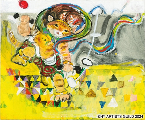 ![]() 「うずまくシゲオの風神」 新趣向の風神雷神の図は、ダイナミックな意匠で色彩豊かに描かれた風神シゲオと雷神バロンです。シゲオが風袋から吹き出す風は渦を巻き、後ろには雷神バロンのいかずちが呼び寄せた雨雲が現われています。久下氏は色の層がうずまく意匠で風神シゲオのパワーを可視化しているかのようです。雷神バロンによる雨といかずちも同様に目に見える威力を見せています。シゲオは頭に海老の尾(豪勢な伊勢海老です)を掲げ、首には大きな金色の鈴をつけています。海老は縁起もの、鈴は言うまでもなく猫の必須アイテムです。