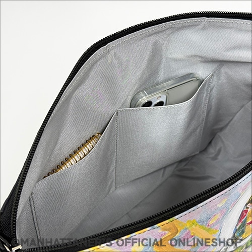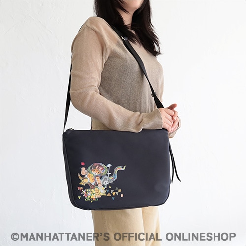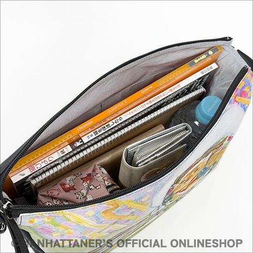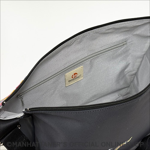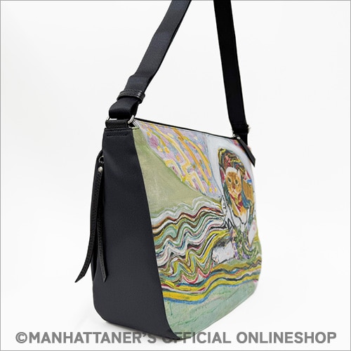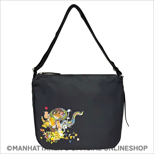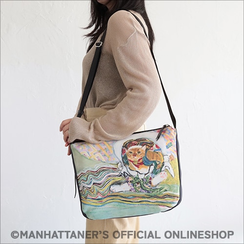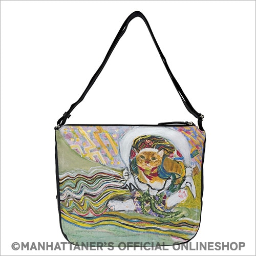 トップ > すべての商品 > 花火 ショルダーバッグ「シゲオとバロンの風神、雷神」 花火 ショルダーバッグ「シゲオとバロンの風神、雷神」ポリエステル素材に和マンハッタナーズの新作を 転写プリントで表現しました。 バッグの前胴には作品の一部を切り抜きワンポイントで表現し、 背胴は作品をそのまま配置しました。 インパクト抜群の色使いが目を引きます。 背景色は黒なので、お洋服にも合わせやすいです◎ ![]() ![]() ![]() 正面 ![]() 背面 ![]() 側面 ![]() 前胴の脇部分にファスナーポケット 長財布が収納できます◎ ![]() 背側にファスナーポケット ![]() 前側にオープンポケット×2 ![]() A4ファイルや500mlのペットボトルが収納可能。 商品素材: 本体:ポリエステル 付属:牛革 商品サイズ: 高さ25cm×幅35.5cm×マチ12cm ショルダー紐の長さ:66〜124cm 重さ:300g 日本製 ![]() 「とどろくバロンの雷神」 新趣向の風神雷神の図は、ダイナミックな意匠で色彩豊かに描かれた風神シゲオと雷神バロンです。バロンがドンと足を踏むと、三角形のいかずちが光を放ち、あたりは金色に輝きます。雷神のパワーをこんな風に表現するとは、流石の久下氏です。子どものおへそを取りに来る雷さまはよく虎の革のパンツを着用していますが、虎模様は自前のバロンなので唐草模様くずしのようなパンツです。頭には蟹の両はさみを掲げ縁起のよさを表現しています。首には大きな金色の鈴をつけています。雷神と言っても、猫ですから鈴が当然のアクセサリーです。