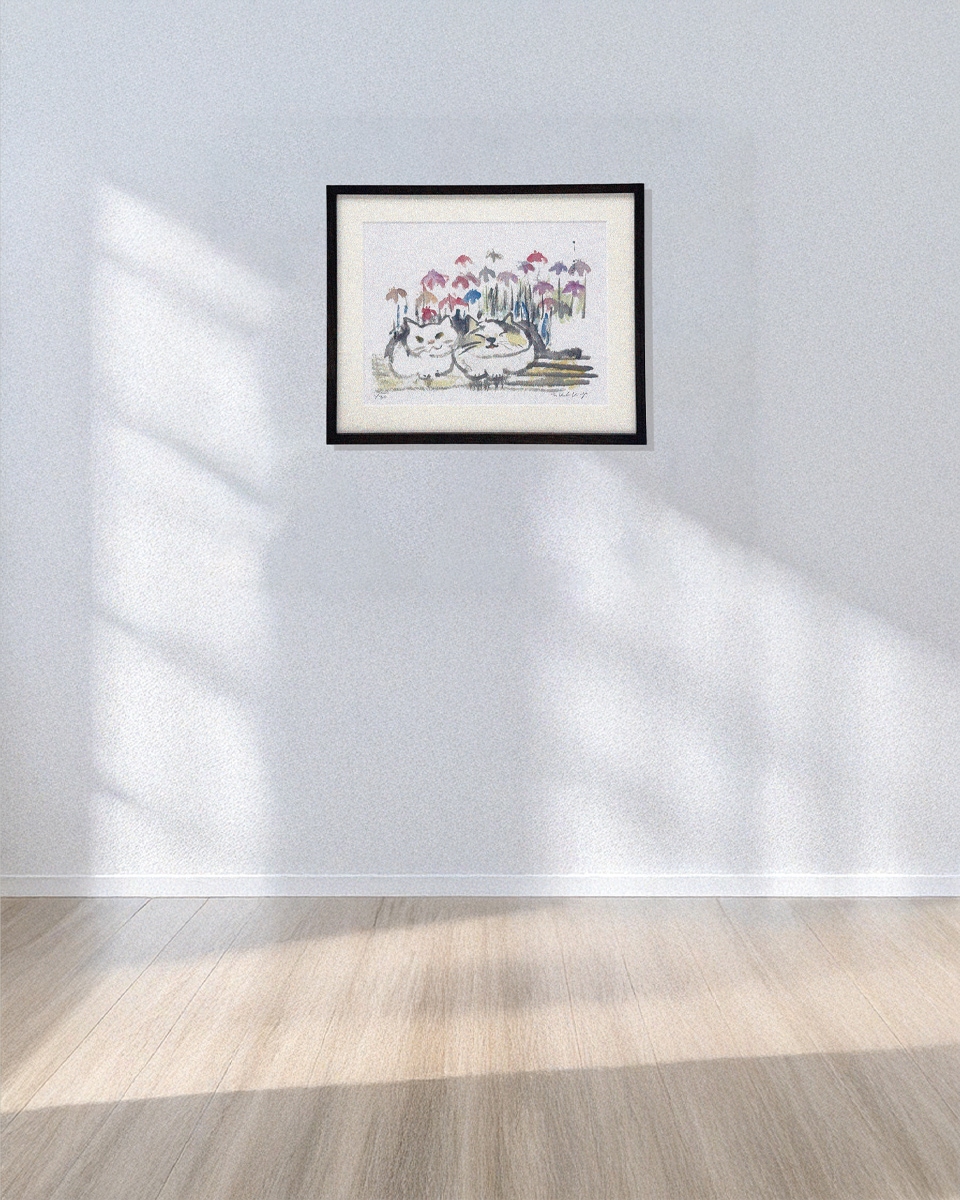 当店限定版画 久下猫ミニ事典 91 番家猫ミックス・タキシード「お行儀見習い中の猫」