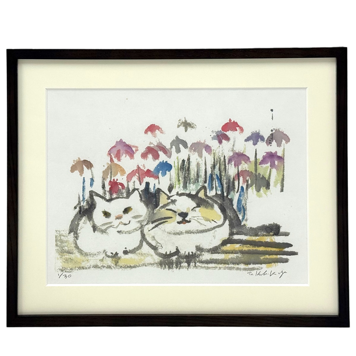 当店限定版画久下猫ミニ事典 115 番家猫ミックス・トーティシェル「洗面器におさまった猫」2013