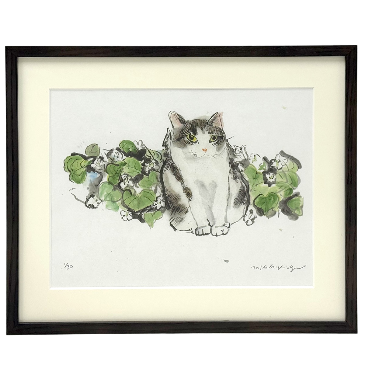 当店限定版画 久下猫ミニ事典 82 番家猫ミックス・グレータビー「草の上でごきげんな猫」
