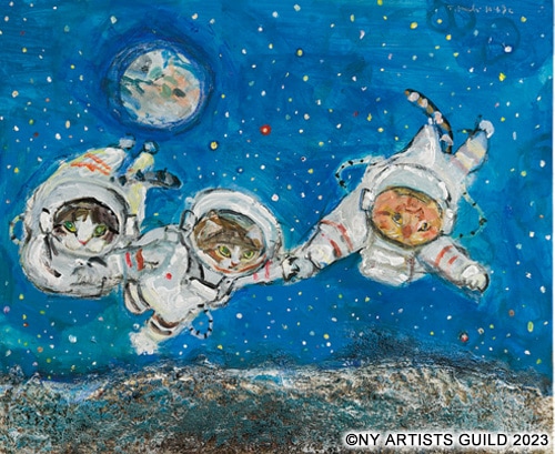 朝食時やティータイム、デスクワークなど あらゆるシーンでお使いいただけます。 可愛い猫たちに気分があがること間違いなしです◎ 自分用はもちろん!ギフトにも最適です!! ![]() ![]() ![]() 外側ぐるりと柄を転写焼き付けしているので、 どの角度から見ても楽しめます◎ ![]() 内側にもワンポイントの猫がいます。 飲み物を飲むたびに目が合うのと、 入れすぎ注意のメモリ代わりにもなり、 可愛さと機能面を兼ね備えています♪ 商品素材:磁器 商品サイズ:縦9.2cm×横8cm 内容量:約280ml(すりきりいっぱい320ml) 重量:約290g 電子レンジ・食洗器使用可能 ※直火・オーブン使用不可 日本製 ![]() Astronaut Cats 「猫の宇宙飛行士」 宇宙におわす猫の神のお導きか、今年に入って宇宙飛行士をテーマにしたニュースやショーウインドウの飾り付けを目にすることが多く、潜水猫は描いたけれども、宇宙遊泳猫はまだだったと、猫たちを宇宙に飛ばした久下氏です。宇宙に浮かぶのは、猫にお似合い、無理が無い、もしかしたら得意技ではないかとさえ思いつつ、フェデリコ、ミケランジェラとシゲオが宇宙を漂う図が、あっという間に完成しました。三人とも幼い顔をしています。これはファンタジー作品なので、リアルを求めて鑑賞するのは無しにしていただき、ぜひ心を宇宙空間に漂わせて、猫たちと一緒に楽しんでください。因みに潜水猫とは、1997年に描いたミケランジェラの「メキシコ湾もぐり」です。